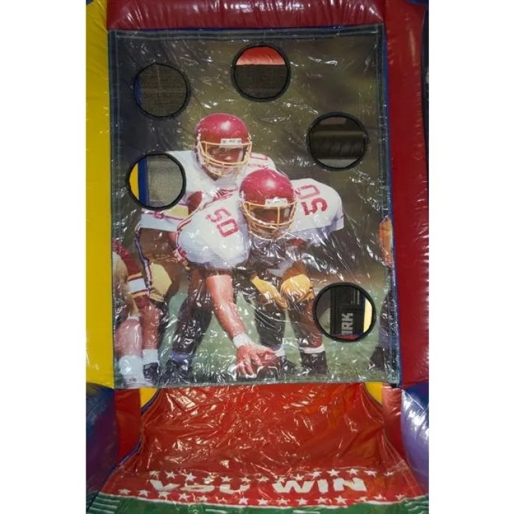 New for 2026 is our 4 in 1 Sports Inflatable. This is a monster attraction suitable for large events and all ages. Featuring Football, Baseball, Soccer, and Basketball all in one exciting package. This game is 28 feet wide and 18 feet long by 15 feet high making it easy to find for sports enthusiasts. All equipment necessary to run this game is included.